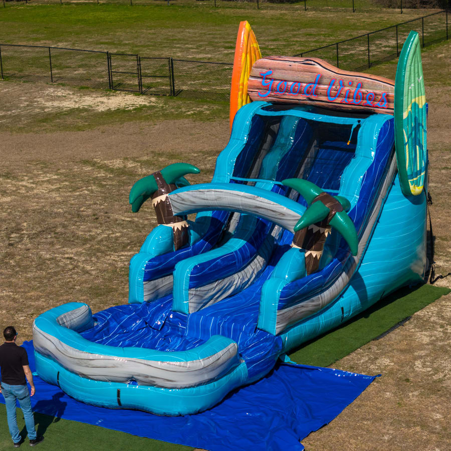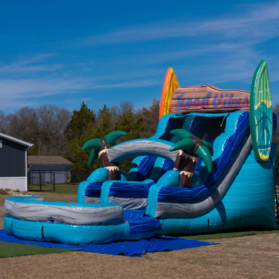 Standing 16 feet tall, the Good Vibes water slide makes a bold statement the moment it’s set up. The vibrant teal and blue color scheme, palm tree details, and eye-catching “Good Vibes” surfboard topper instantly create that summer-beach atmosphere your guests will love. It’s the perfect centerpiece for outdoor events across Waxahachie and surrounding areas.